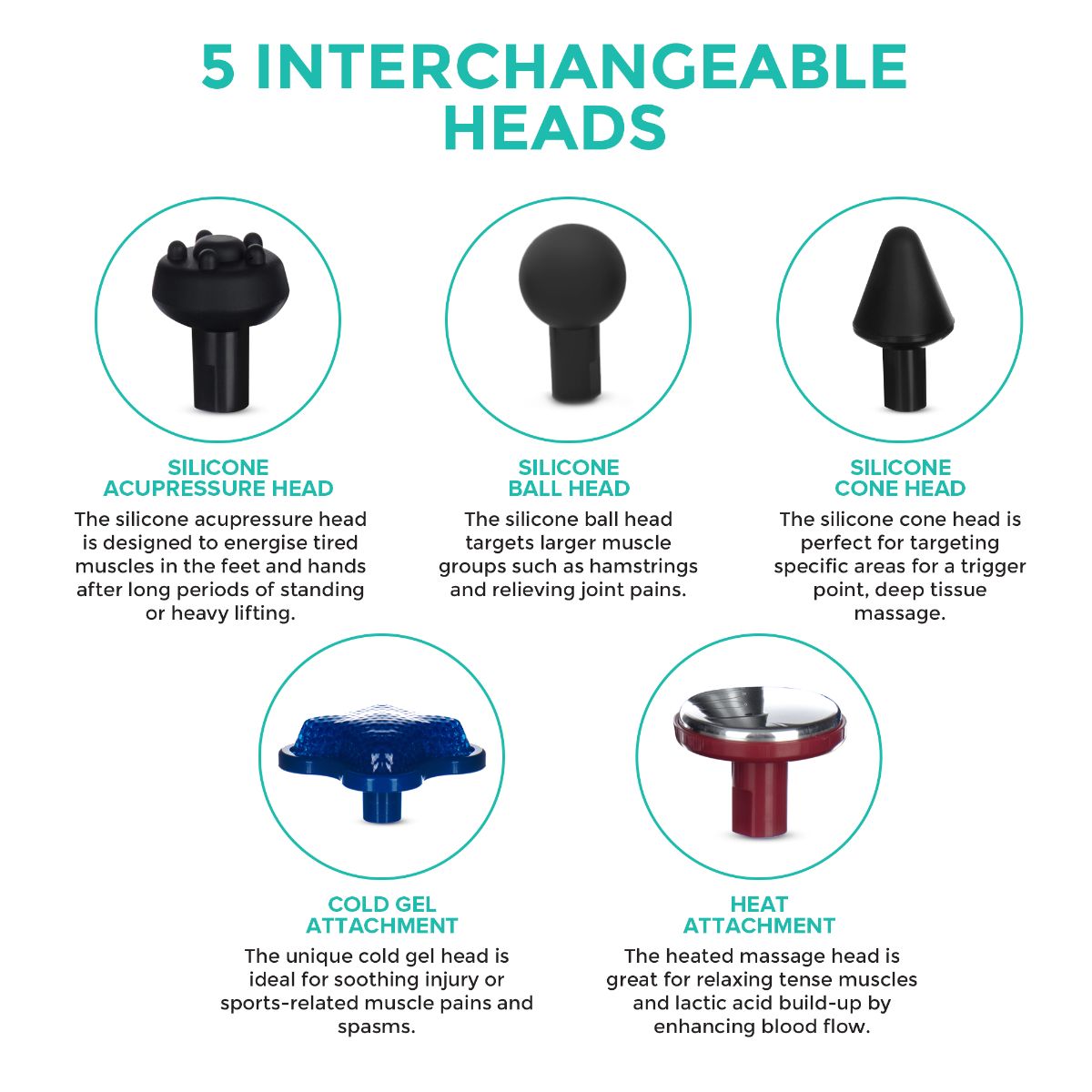 - 5 DIFFERENT HEADS AND FUNCTIONS – 5 different attachments: cold gel, heat, silicone acupressure head, silicone ball head, silicone cone head.